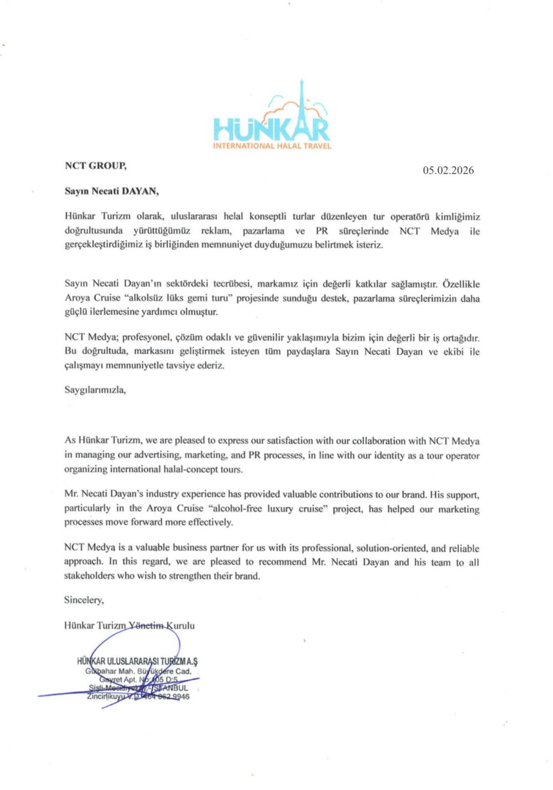 Mektupta belirtildiği üzere; NCT Medya’nın profesyonel, çözüm odaklı ve güveniliryaklaşımı, Hünkar Turizm’in uluslararası helal konseptli tur operatörü kimliğiyle tam uyum sağladı. Yazıda şu ifadelere yer verildi: